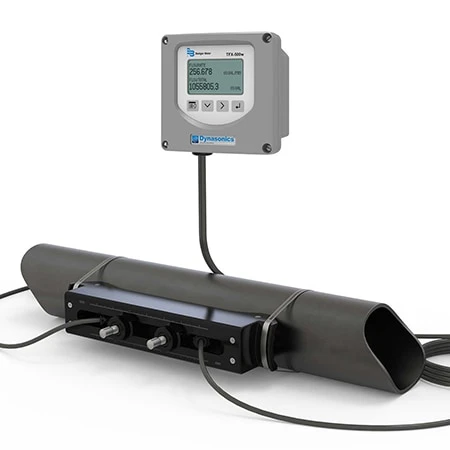 The TFX-500w transit time ultrasonic flow meter measures volumetric flow of clean water in pipes 10 in. or smaller. By clamping on the outside of the pipe, the ultrasonic meter installs without cutting or tapping the pipe.