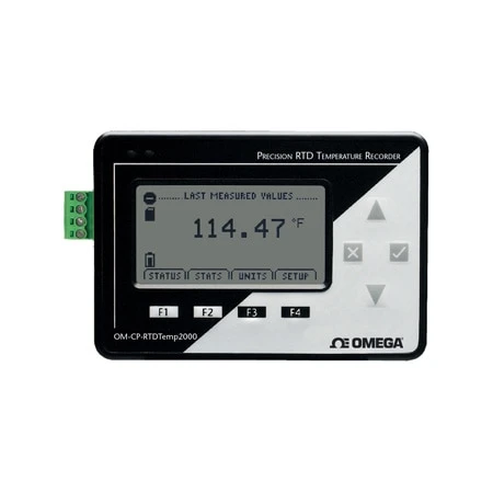 The OM-CP-RTDTEMP2000 is a battery powered precision RTD temperature recorder, with a LCD display. It is perfect for applications requiring precise temperature readings. The 8-button keypad and large LCD provide convenient access to current data and recorder setup. Additionally, memory and battery levels, external power status, and sampling and recording status are shown on the LCD.
