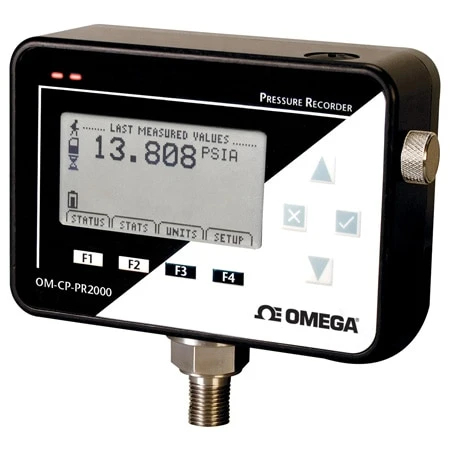 The OM-CP-PR2000 is a battery powered recorder with a LCD display. It is perfect for applications requiring display pressures readings and a logger. The 8-button keypad and large LCD provide convenient access to current data and recorder setup. Additionally, memory and battery levels, external power status, and sampling and recording status are shown on the LCD.